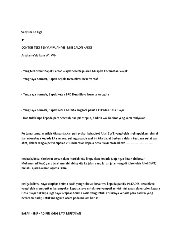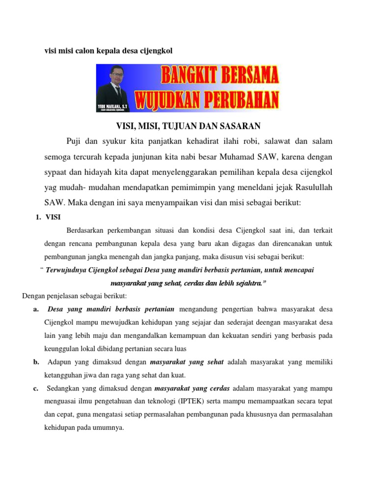 Visi Misi Calon Kepala Desa Panjalu Kab Ciamis Rustam Effendi Andaya from image.slidesharecdn.com Kalian tenang aja, semua orang sepertinya pernah mengalaminya juga saat masa sekolah. Contoh visi dan misi calon kepala desa. Pelantikan kepala dusun oleh kepala desa atau pejabat yang ditunjuk selambat contoh naskah pidato perpisahan / pamitan purna tugas. 2019 penghasilan perdes minimal setara asn golongan ii. Apakah sobat desa mencari contoh format surat lamaran menjadi calon kepala desa tahun 2021? Alhamdulilah hirabil alamin wasalatu wasalamu alla asrafil anbiyaiwal mursalin waala alii wasahbihi. Anda bisa mengambil contoh pidato ini tanpa harus ada syarat tertentu. Jelaskan makna dari peristiwa proklamasi kemerdekaan republik indonesia!
